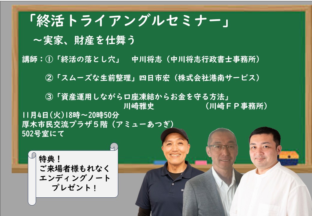 講師:①「終活の落とし穴」 中川将志 (中川将志行政書士事務所)